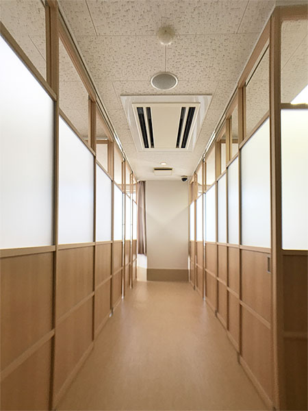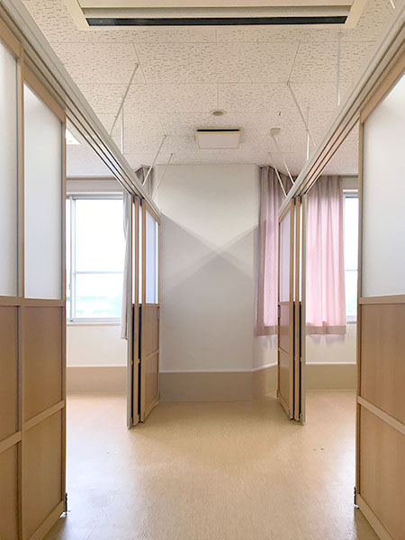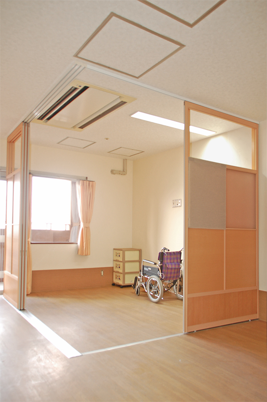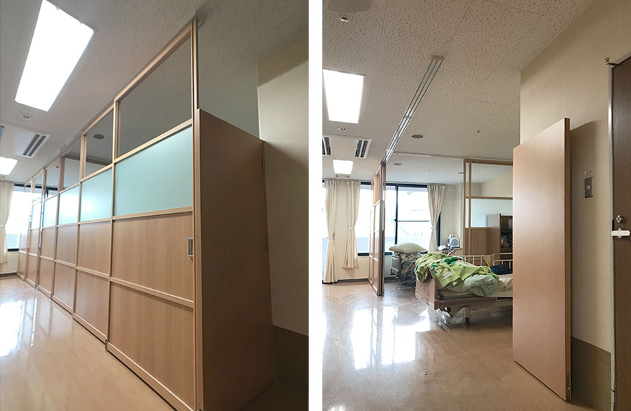 病室や特別養護老人ホームなど介護施設のベットまわりをアルミ建具で間仕切ることで、